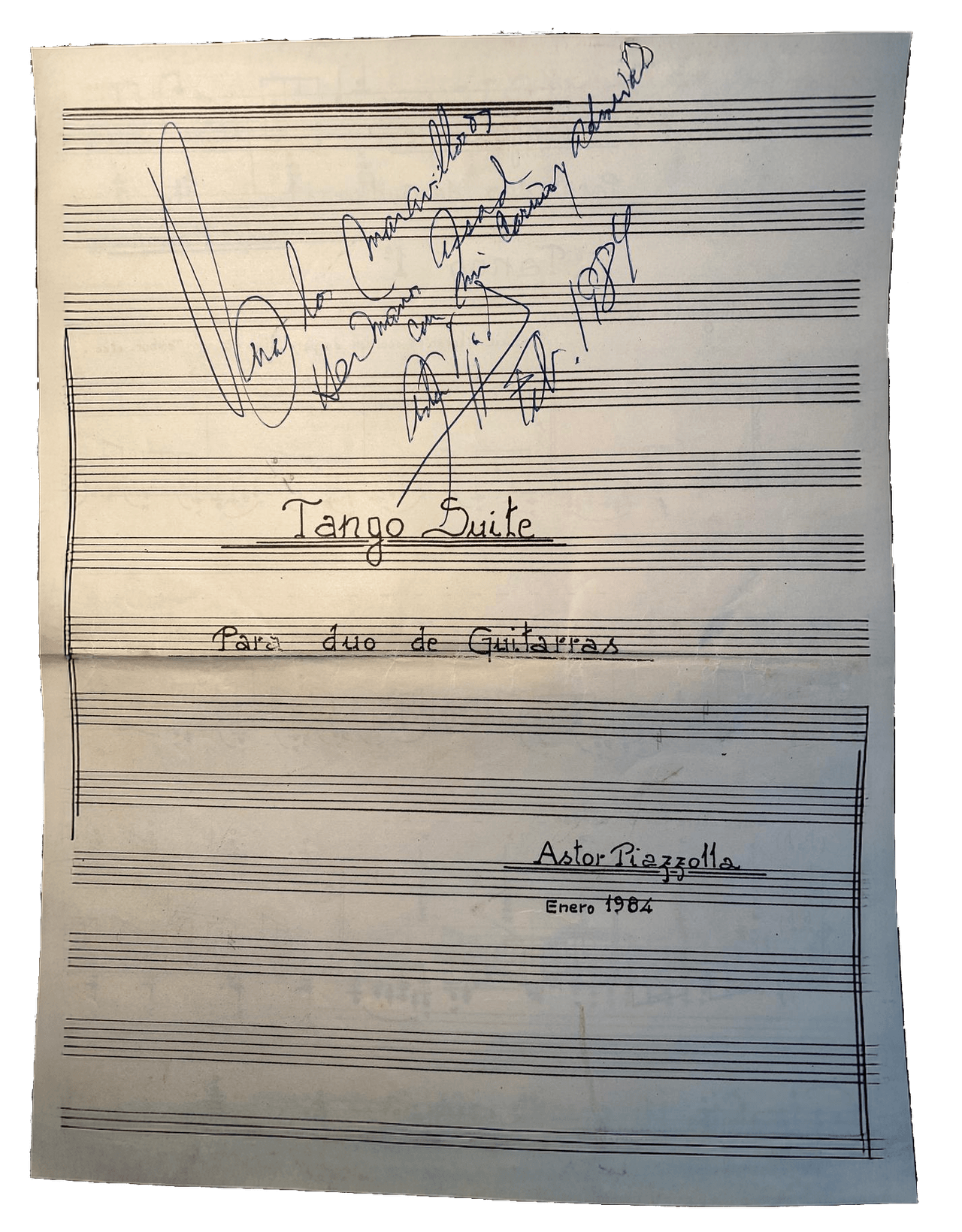Partitura original de Tango Suite, de Astor Piazzolla, dedicada aos irmãos Assad.